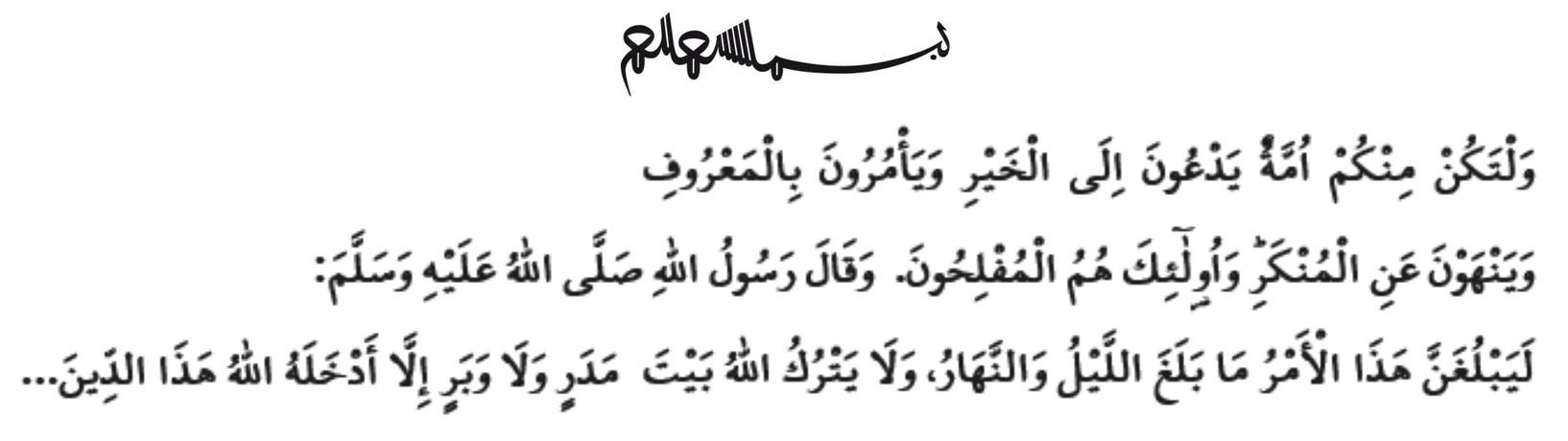 „(ო, მორწმუნენო!) და იყოს ხალხი თქვენგან სიკეთისკენ მომწოდებელი, მბრძანები მოსაწონისა და უკეთურების აღმკვეთი, და სწორედ, ეგენი არიან ნეტარნი“. (ალი იმრანი 3/104)