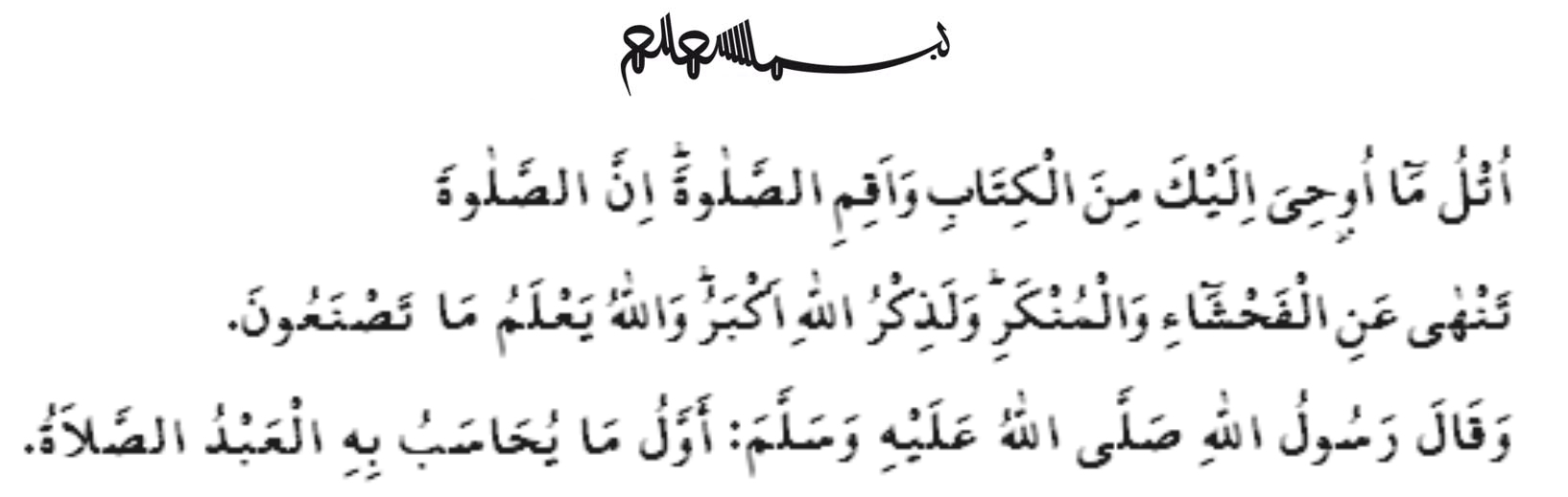 „წაიკითხე ის, რაც შთაგეგონა წიგნიდან[1] და აღავლინე ლოცვა. უეჭველად, ლოცვა განდევნის სიავენს და უკეთურს. და რა თქმა უნდა, ალლაჰის ხსენება მნიშვნელოვანია. და ალლაჰი უწყის, რასაც სჩადიხართ!“ (ანქებუთ, 29/45)