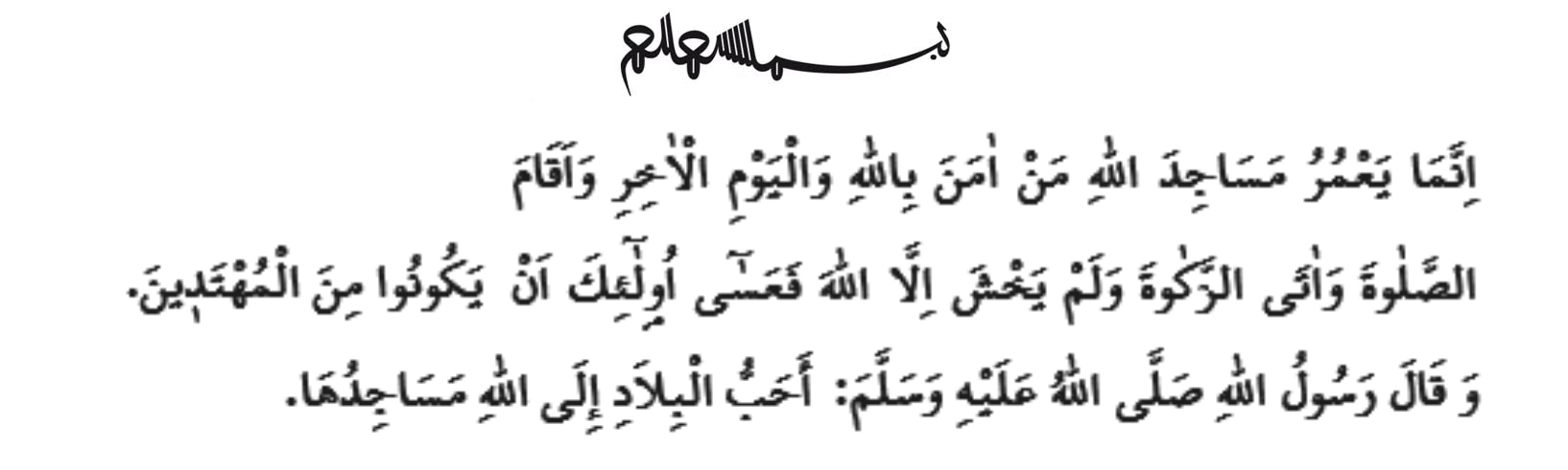 „მხოლოდ ის ააგებს ალლაჰის სამლოცველოებს, ვინც ირწმუნა ალლაჰი, დღე უკანასკნელი და აღავლინა ლოცვა, გაიღო ზექათი და არ აქვს შიში, გარდა ალლაჰისა. ეგების ჭეშმარიტ გზაზე მავალნი იყვნენ ეგენი!“ (თევბე, 9/18)