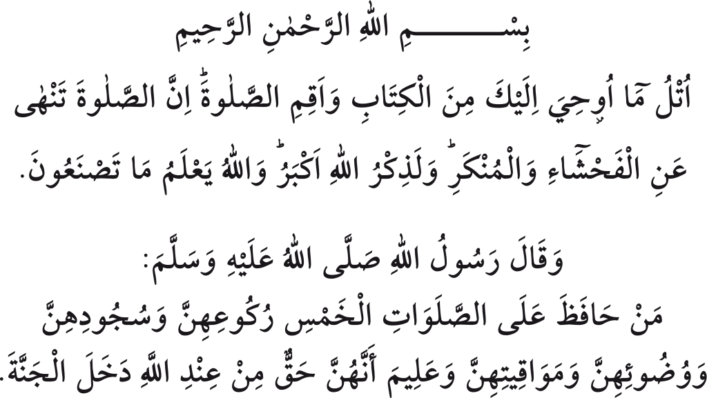 „წაიკითხე ის, რაც შთაგეგონა წიგნიდან და აღავლინე ლოცვა. უეჭველად, ლოცვა განდევნის სიავენს და უკეთურს. და რა თქმა უნდა, ალლაჰის ხსენება  მნიშვნელოვანია. და ალლაჰი უწყის, რასაც სჩადიხართ!“ (იხ. ანქებუთ 29/45)