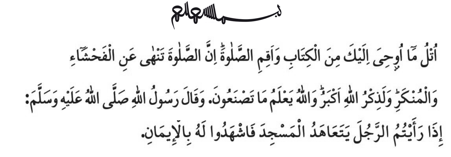 ამით მიანიშნა, რომ ლოცვა და მეჩეთი ერთი მთლიანობის ორი ნაწილია და ჭეშმარიტი რწმენის ნიშანია. მართლაც, მეჩეთები ღვთის სახლებია, ქაღ’ბას ნაწილკ, ჩვენი ქალაქების გული და ჩვენი ცივილიზაციის საძირკველი. ისინი მშვიდობისა და თანხმობის სიმბოლოებია. მეჩეთში გვერდიგვერდ მდგარი მორწმუნეები ძმობას განამტკიცებენ და სწორი ცოდნით ცხოვრებას დაამშვენებენ.
