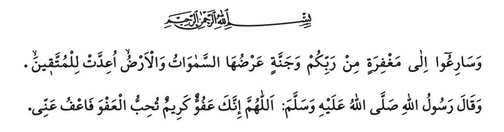 „ესწრაფეთ მიტევებისკენ თქვენი ღმერთისგან და სამოთხეს, რომლის სივრცე ცანი და დედამიწაა, რომელიც გამზადებულია ღვთისმოშიშთათვის“, (ალი იმრან 3/133)